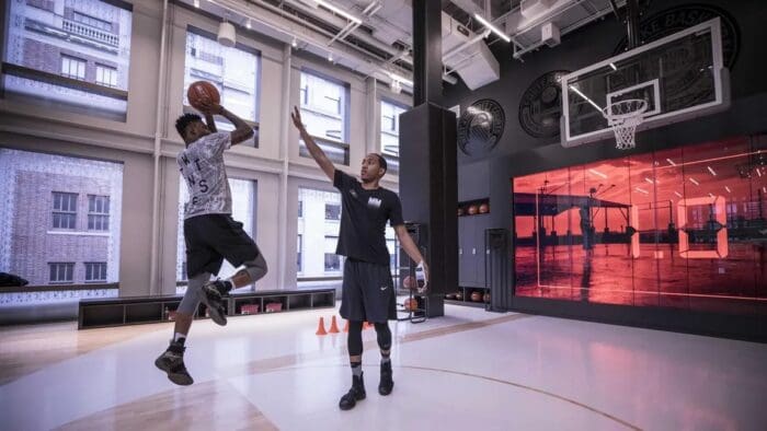 The sports brand’s 55,000-square foot space in SoHo featured five stories full of interactive spaces, such as a basketball half-court with digital video screens and adjustable hoops. It also had an enclosed soccer trial area and a treadmill with a jumbotron to simulate outdoor runs.