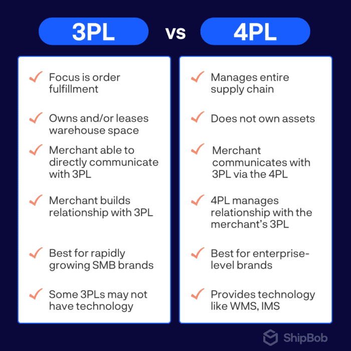 Unlike a 3PL, a 4PL adds an additional degree of separation between the merchant and the 3PL as they manage the relationship with the 3PL instead.