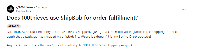 With a small apparel team, every second we spend working is essential in ensuring that each launch is successful. Before ShipBob, 100 Thieves did not have a system, and it became overwhelming trying to manage thousands of orders per drop.