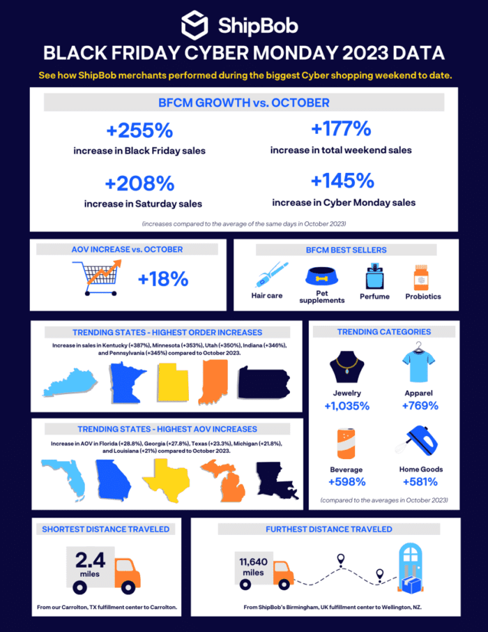 As a leading ecommerce enablement and fulfilment platform, ShipBob has a front-row seat to the magic of BFCM – and all the logistics that make it happen. We thought we’d share some of the top insights we saw throughout this year’s peak season – from our thousands of customers fulfilling orders across the globe – so you can leverage them in Q4 and beyond!