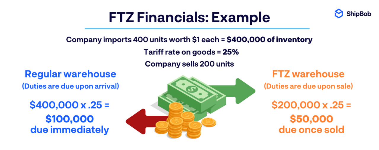 But if the brand leverages an FTZ warehouse, they would not pay any duties or taxes right away. That $100,000 stays in their account, and they would to pay the 25% tariff only after the inventory is sold.