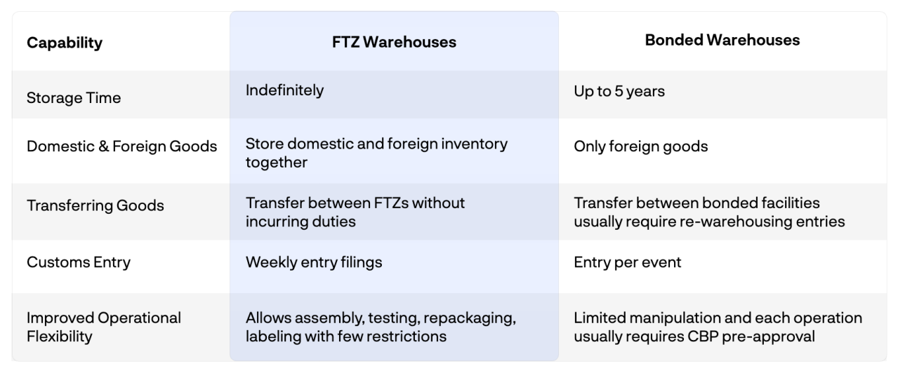 • Smaller import volumes: When monthly duty savings don’t exceed FTZ compliance costs, bonded warehouses deliver sufficient benefits without the administrative burden.
