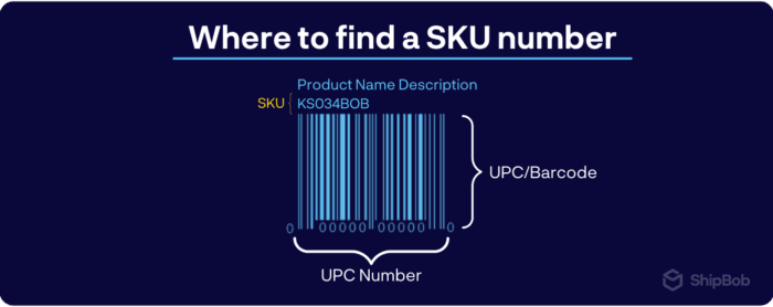 In this example, while the 12-digit numeric code on the bottom is the product’s UPC (Universal Product Code), the alphanumeric code at the top is the SKU number (which is different from the UPC).