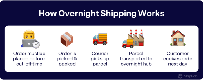 Overnight shipping is an expedited shipping option that involves several steps to ensure customers receive their orders within a short timeframe. While overnight shipping varies from courier to courier, you can expect each to follow these steps.