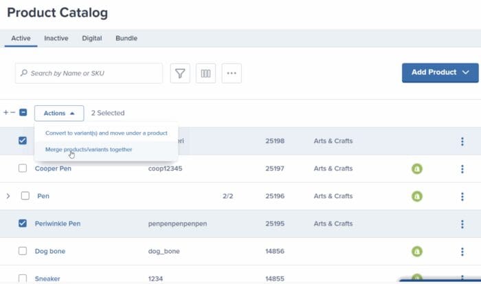 The page is neatly organised, with tabs to navigate between active, inactive, digital, and bundle products. Besides product names and SKUs, merchants can easily view other essential information, such as product categories and sales channels. The page also allows a merchant to add variants, merge them, move them under a different product, and many other actions that may be necessary for effective catalogue management.