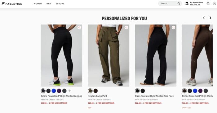 Fabletics uses their external-facing product catalogues to create highly personalised shopping experiences for potential customers. The brand asks you a series of questions related to the products you’re looking for, the colours and patterns you like, and the size you need. The website then displays a product catalogue that’s uniquely tailored to the needs and preferences of each customer. For example, if you specify that you’re looking for “bottoms” in the questionnaire, you’ll get a personalised selection of leggings and pants that match your preferences.