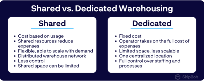 Choosing between shared and dedicated warehousing depends on factors like budget, flexibility, and warehouse management needs. Here’s a deeper look at how these two models compare.
