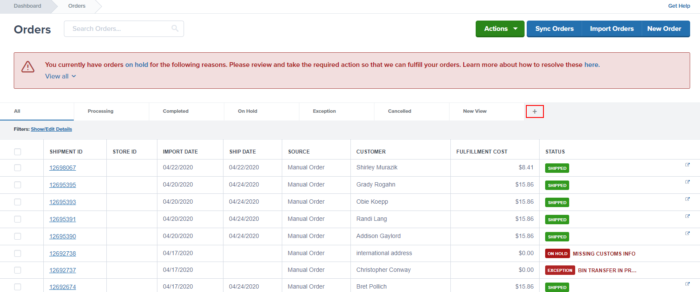 In addition to sending confirmation emails to your customers as soon as their orders ship, ShipBob also allows you to filter orders by tracking status, search for specific orders, and edit shipping details when customers accidentally make typos when entering their addresses (trust us, this happens a lot!).