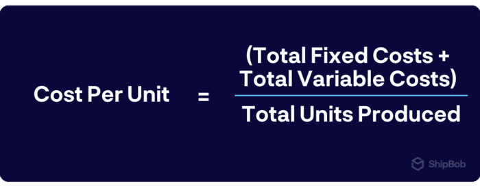 Total cost per unit is how much it costs to produce a single item, receive new inventory, store it, and fulfill and ship it. Cost per unit is calculated using the formula: (Total fixed costs + Total variable costs) / Total units produced.