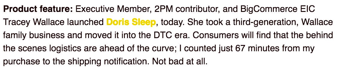 One of my very first customers was an influencer in the ecommerce space, Web Smith, who runs 2PM. He posted about his experience purchasing from Doris Sleep in his newsletter and, to my surprise and delight, left a raving review about the checkout experience.