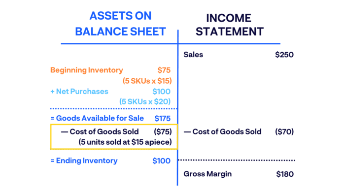 For example, let’s say you bought 5 of one SKU at $15 each and then another 5 of the same SKU at $20 each a few months later. If these 10 same products are in your available inventory and you sell 5 of them, using FIFO you would sell the first ones you bought at $15 each and record $70 as the cost of goods sold.