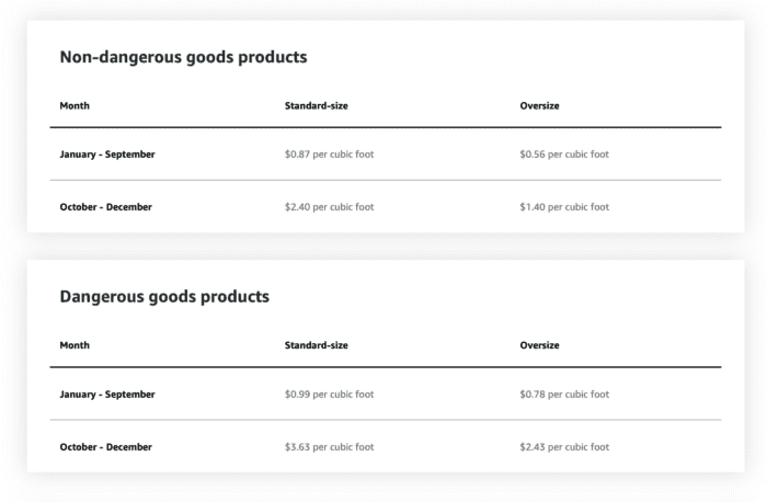 Storage fees for Amazon Multi-Channel Fulfillment are also seasonal. During the busy holiday shopping and peak season, Amazon increases storage fees per cubic foot. This can quickly cut into your profits during the holiday season.