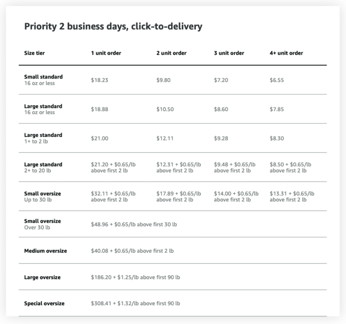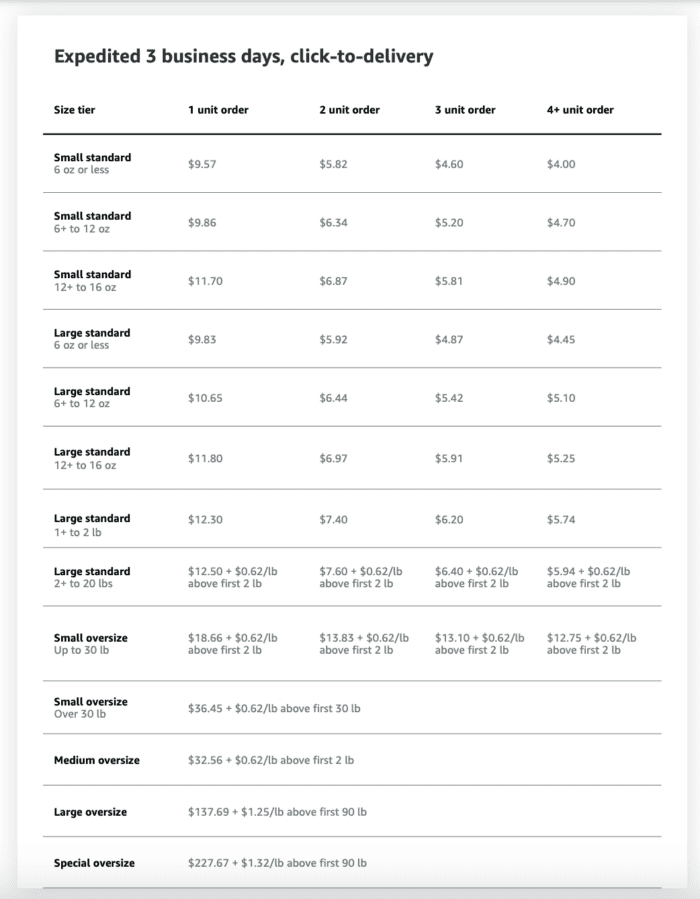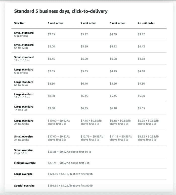 Amazon also offers tiered discounting for multi-unit orders. This means that the more units your order includes (up to 4+), Amazon will discount the overall fulfillment price for that order. They offer this discounting structure across each of their 3 delivery speed options.