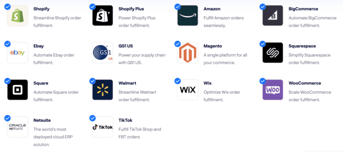 Amazon integrates with major ecommerce platforms like Shopify and Big Commerce, as well as popular supporting tools. By integrating your website and other channels with Amazon, any order that’s placed is automatically sent to an Amazon warehouse.