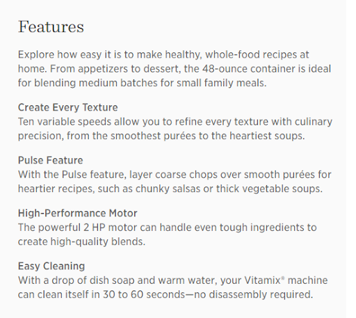 • Add a bulleted list of product features and the benefits they provide – Use a short list (include icons if you can, for a visual element) so shoppers can scan the product page for need-to-know specs.