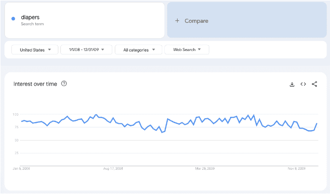 Take the Google Trends report from the US Great Recession in 2008. Despite an economic crisis, diapers remained a heavily searched item for consumers.