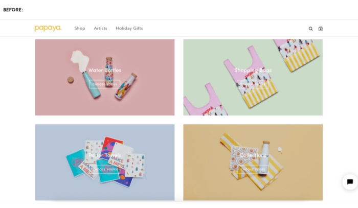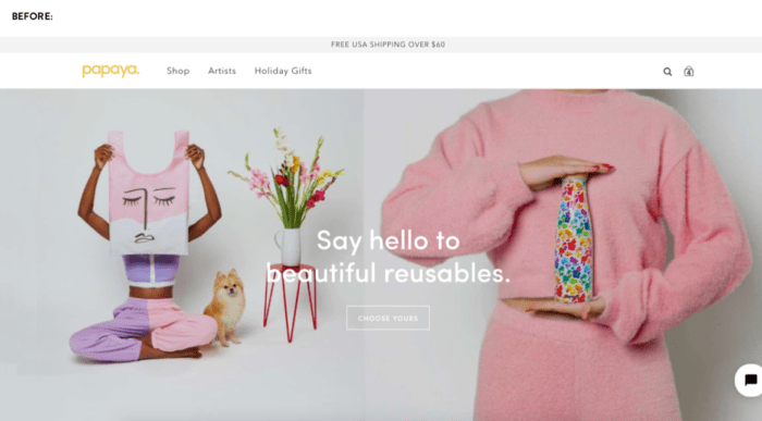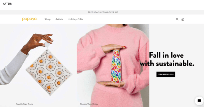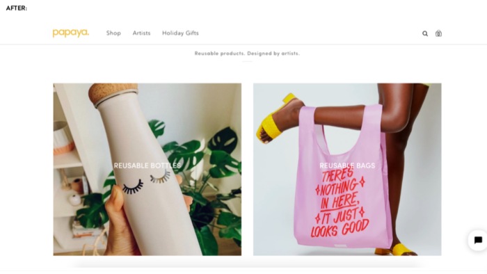 For example, during the live website teardown session, ecommerce brand Papaya Reusables got the following feedback from Jon: “Make sure it’s extremely clear what you’re selling upfront,”so they reevaluated their hero image selection and added callouts to their products over the product images (see below for the before and after photos).