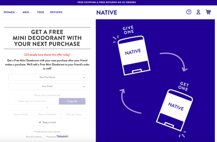 For example, Deodorant brand Native offers a free mini deodorant with your next purchase (see below).