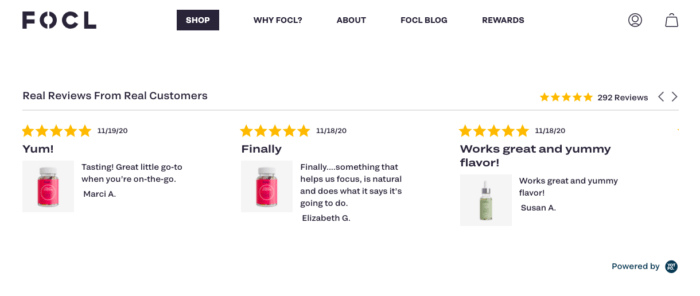 Instead of displaying lengthy reviews, highlight key statements customers have made that emphasize the value of your products. Below is a great example from FOCL (a CBD brand) that showcases their reviews well.