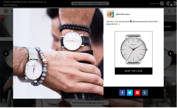 If you are going to embed Instagram social posts (which are great to visually display social proof around products), make sure to include a shopping feature that makes it easy for shoppers to buy directly from Instagram with a ‘Shop the Look’ CTA. Luxury watch brand Brathwait does this well (see below).