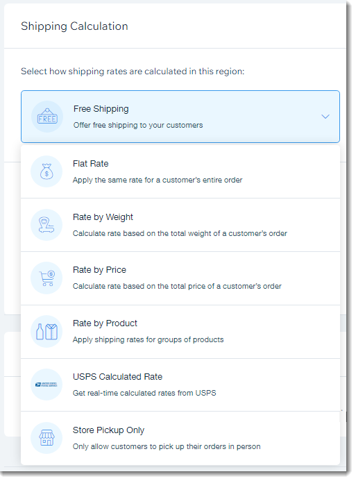 You can choose from several different Wix shipping options, including flat rate, order weight, order total, or by product group. If you have a physical storefronts, you also have the option to include a ‘Store Pickup’ option.