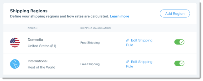 By default, you will see two shipping regions added automatically: one for your own country (i.e., ‘Domestic’) and one for new regions i.e the rest of the world (i.e., ‘International’). From here, you can choose which countries or specific locations you want to ship to by clicking ‘Add Region.’