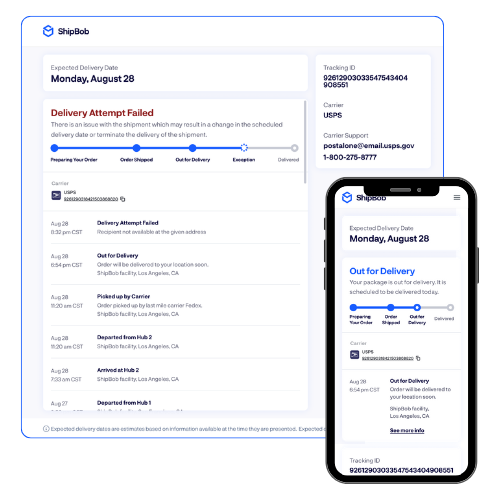 When an order is zone skipped, it’s transported via ShipBob’s middle-mile network from the regional hub closest to the spoke fulfillment center to the hub nearest the end customer. From there, it’s handed off to a last-mile carrier for a shorter zone delivery. Because ShipBob manages the majority of the order’s journey, shipments bypass multiple shipping zones and are consolidated with others heading to nearby destinations. This results in faster transit times, fewer handoffs, and a lower risk of damage. Plus, zone-skipped orders come with enhanced tracking data via TrackBob, a branded tracking page both in the dashboard and accessible by your end customers.