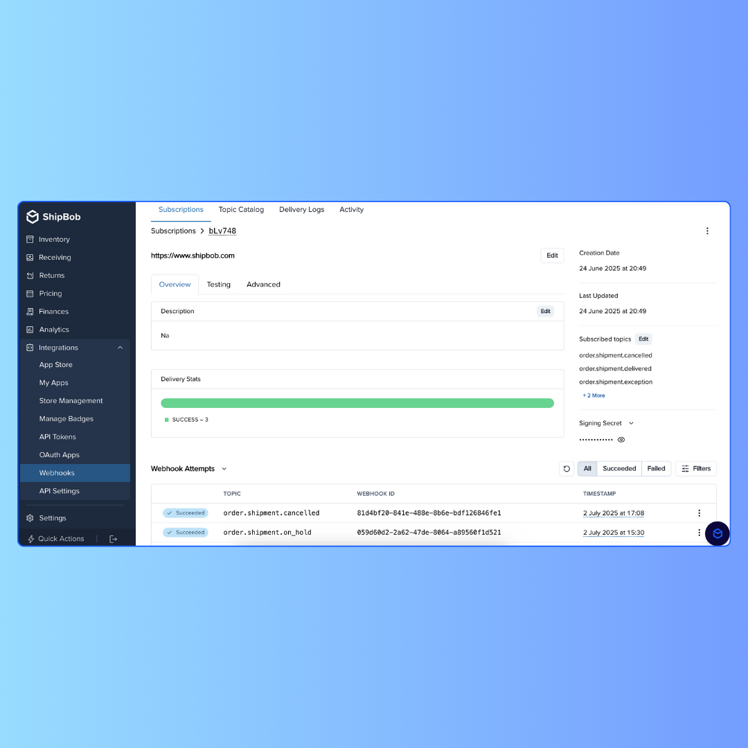 ShipBob now offers a powerful webhook delivery engine with built-in management, directly accessible from the merchant dashboard. Users can view delivery success rates and message history, test or replay failed events instantly, and access detailed payloads and diagnostics for tighter integration and faster troubleshooting. Learn more.