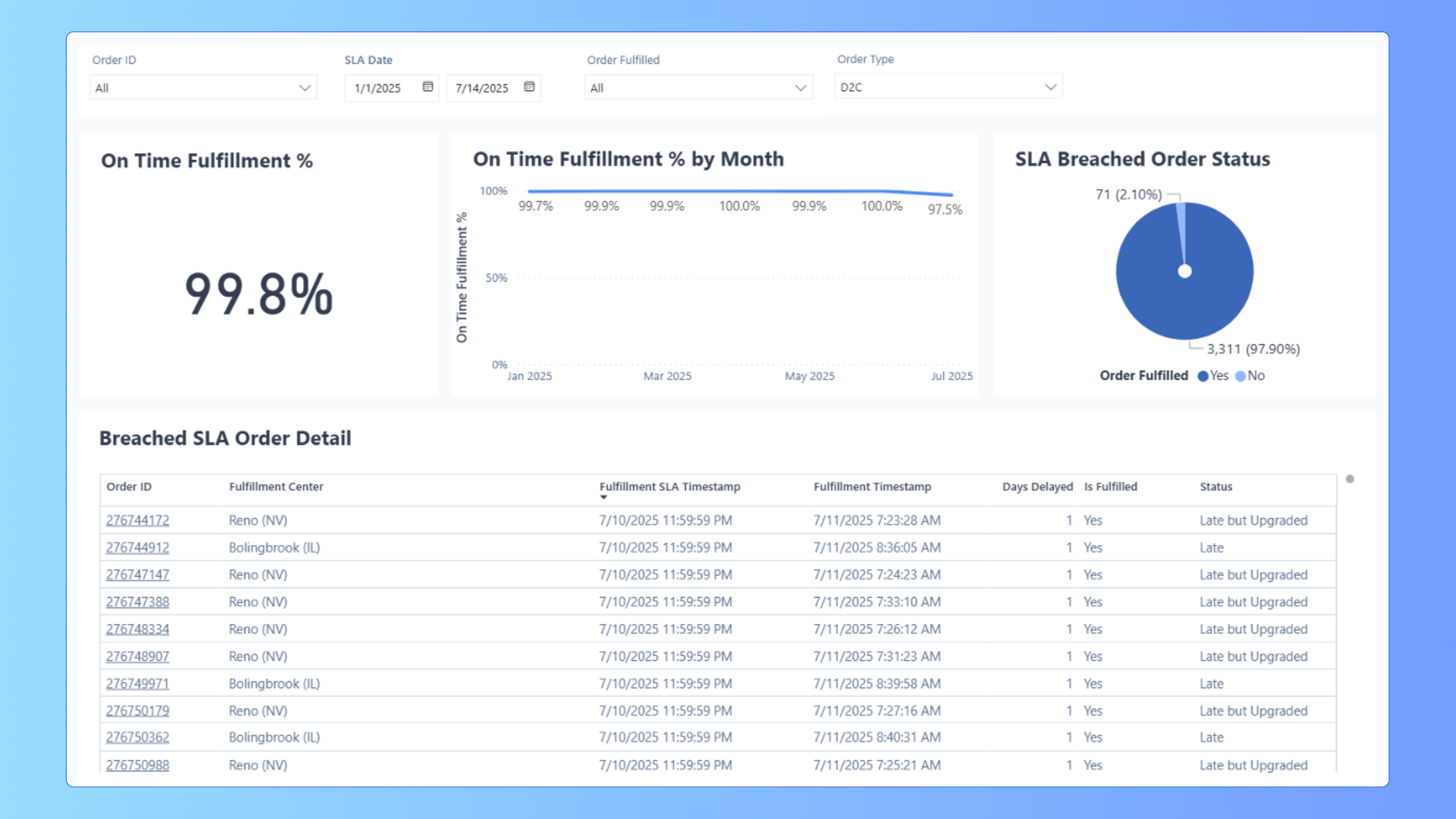 - SLA Report: Track on-time vs. late order fulfillment, see trends by fulfillment center, and identify orders affected by SLA breaches.