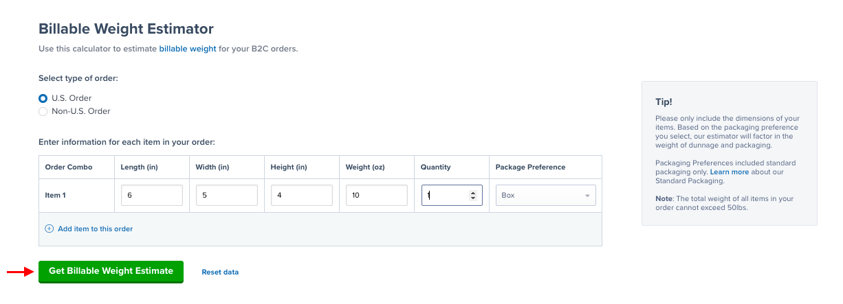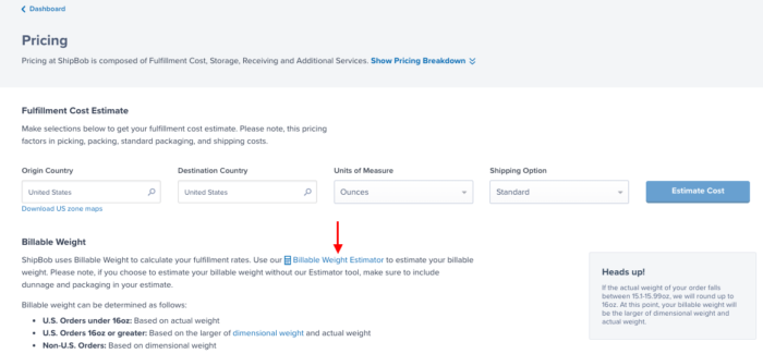 To help you track and optimise shipping costs, ShipBob provides you with a Billable Weight Estimator, which makes it easy to calculate your shipment’s billable weight as part of your fulfilment costs.