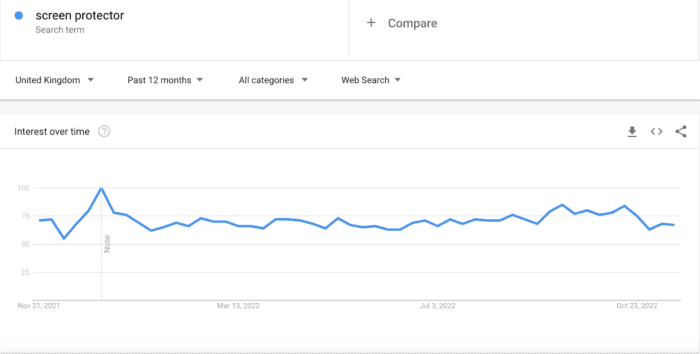 As seen in this Google Trends report, headphones are popular with consumers throughout the year. The 100 along the y-axis indicates peak search volume for the term, which was reached during the Cyber shopping weekend in 2023. This shows that despite headphones being consistently popular, the demand continues to grow.