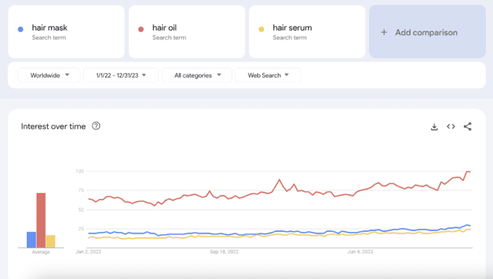 Hair treatments like hair masks, serums, and oils are popular. An emphasis on hair and scalp health has been popular in recent years. Consider the Google Trends report on consumer interest in hair treatments.
