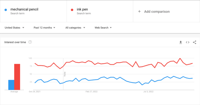 For example, if you own a stationary business and are interested in offering writing utensils on your store, you could use Google Trends to see if you’d be better off selling pencils or pens. In this instance, ink pens are more popular and may be a better niche than pencils.