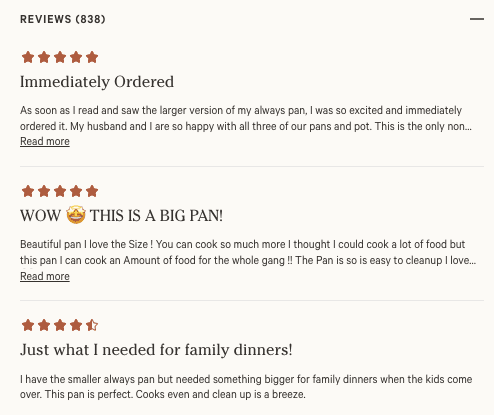 Take ShipBob customer Our Place, for example. Right under their product description, they showcase a list of reviews from customers who have already purchased (and loved) the product.
