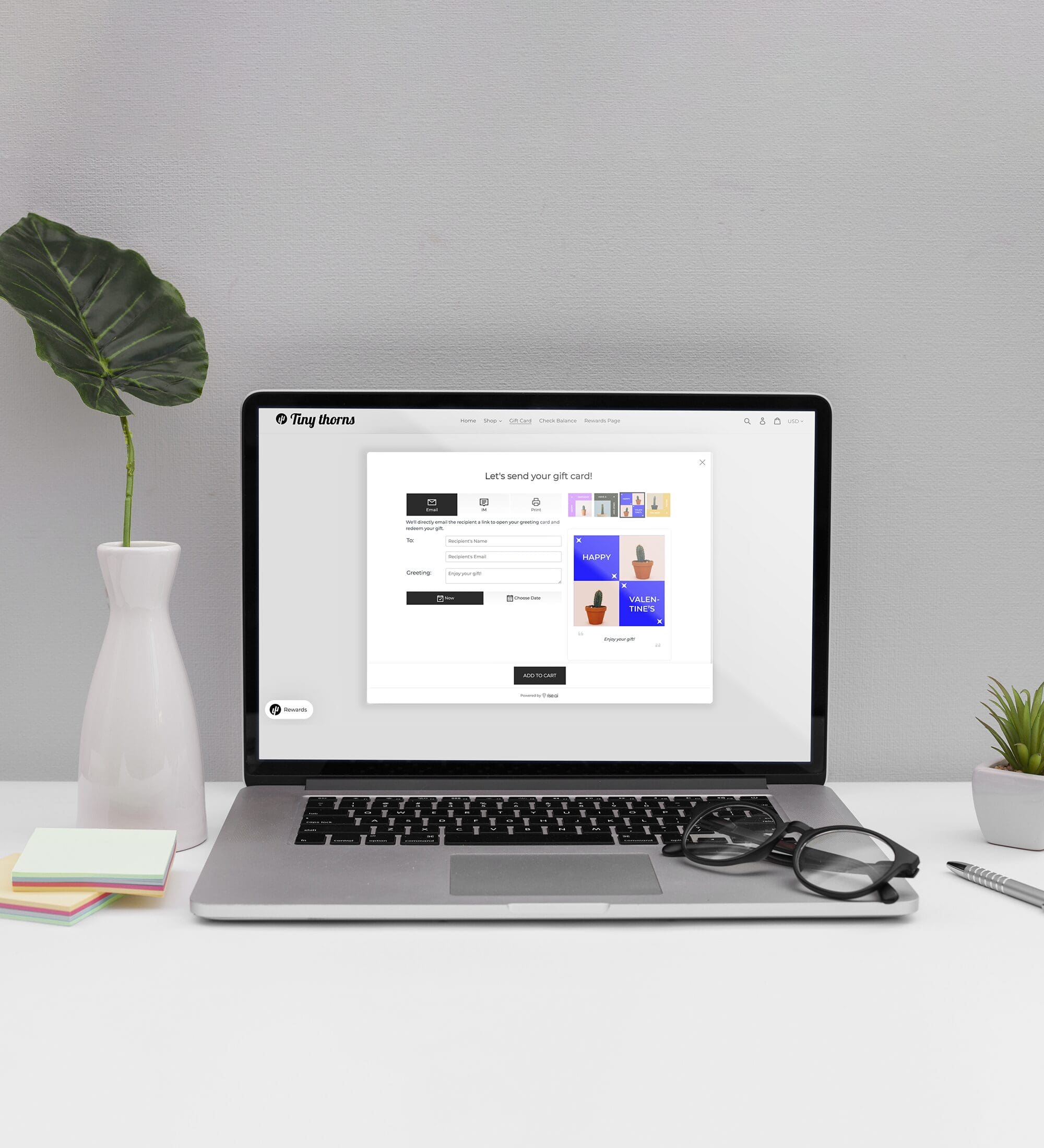 Build an advanced branded gifting experience: Enable customers to schedule and send Gift Cards, create Gift Cards in bulk, and sell physical Gift Cards.
