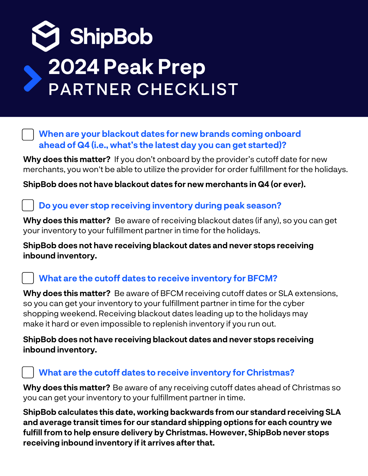Time is running out – don’t let fulfilment be an afterthought for peak. ShipBob is here to help fulfil all of your BFCM orders. While we never stop receiving goods in our warehouses or taking on new clients, we’re counting down the days left until Black Friday.